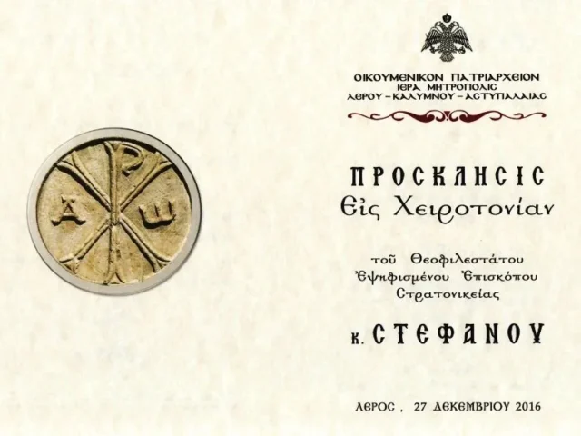 Με την αρμόζουσα εκκλησιαστική τάξη, βυζαντινή μεγαλοπρέπεια και Πατριαρχικό τυπικό, τελέστηκε σήμερα, Τρίτη 27 Δεκεμβρίου 2016, η εις Επίσκοπον Χειροτονία του Ιεροκήρυκα της Ιεράς Μητροπόλεως Λέρου, Καλύμνου και Αστυπαλαίας κ. Στεφάνου, από τον Σεβασμιώτατο Μητροπολίτη Λέρου, Καλύμνου και Αστυπαλαίας κ. Παΐσιο, στον Ιερό Μητροπολιτικό Ναό «Ευαγγελισμός της Θεοτόκου» στην Λέρο.