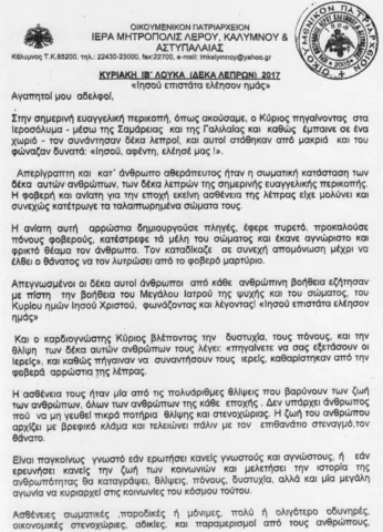 Σεβασμιώτατοι, ¶γιοι Αρχιερείς, Τίμιον Πρεσβυτέριον, Χριστού Διακονία, ¶ρχοντες, Φιλόχρηστε και Περιούσιε Λαέ της Ιεράς Μητροπόλεως Λέρου, Καλύμνου και Αστυπαλαίας.