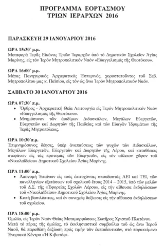 Με μεγάλη λαμπρότητα και την αρμόζουσα εκκλησιαστική τάξη τελέσθηκε στη Λέρο, το Σάββατο 30 Ιανουαρίου 2016, η μνήμη των Τριών Μεγάλων Ιεραρχών, Βασιλείου του Μεγάλου, Γρηγορίου του Θεολόγου και Ιωάννου του Χρυσοστόμου.