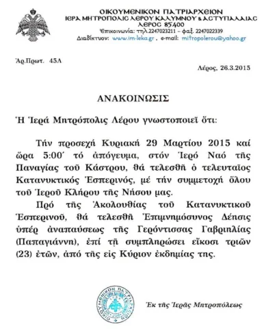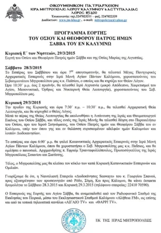 ΕΟΡΤΑΣΜΟΣ ΟΣΙΟΥ ΠΑΪΣΙΟΥ-ΠΑΝΑΓΗ ΜΠΑΣΙΑ 2015 Με μεγαλοπρέπεια εορτάστηκε στη Λέρο η μνήμη του Οσίου και Θεοφόρου Πατρός ημών Παϊσίου-Παναγή Μπασιά. Το Σάββατο 6 Ιουνίου, στο ομώνυμο παρεκκλήσι του Οσίου Παϊσίου-Παναγή Μπασιά, στην περιοχή «Γερμανός» της νήσου Λέρου, που ανήγειρε η ευσέβεια της οικογενείας Δημητρίου και Aννης Αναστασίου, ετελέσθη Μέγας Πανηγυρικός Αρχιερατικός Εσπερινός μετΆ αρτοκλασίας, […]