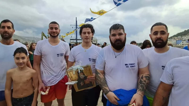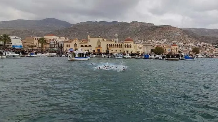 Δέκα ήταν οι τολμηροί νεαροί κολυμβητές που βούτηξαν στη θάλασσα για να πιάσουν το σταυρό. Ο 17χρονος Γιάννης Μαγριπλής, μαθητής Γ΄Λυκείου και πρωταθλητής του ΠΡΩΤΕΑ Ναυταθλητικού Ομίλου Καλύμνου αναδείχθηκε ο τυχερός της ημέρας, καθώς κατάφερε να πιάσει τον Σταυρό γεγονός που προκάλεσε συγκίνηση και χειροκροτήματα από το πλήθος. Ο Μητροπολίτης του εδώρισε μία μεγάλη εικόνα του Αγίου Σάββα.