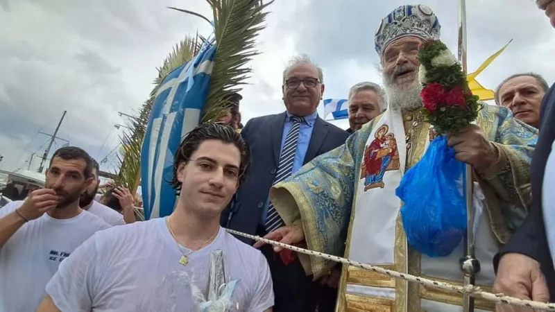 Εν συνεχεία, με τη δέουσα μεγαλοπρέπεια πραγματοποιήθηκε η τελετή αγιασμού των υδάτων. Με Ιερά Πομπή Κλήρος, Αρχές και Λαός, συνοδεία της Δημοτικής Φιλαρμονικής, κατευθύνθηκαν στο προβλήτα, απέναντι από την Εθνική Τράπεζα, όπου λίγο μετά τις 11 το πρωί, έλαβε χώρα η τελετή της καταδύσεως του Τιμίου Σταυρού, ενώ η προσέλευση κόσμου ήταν εντυπωσιακή, συνεργούντος και του χειμωνιάτικου, αλλά καλού συννεφιασμένου καιρού.