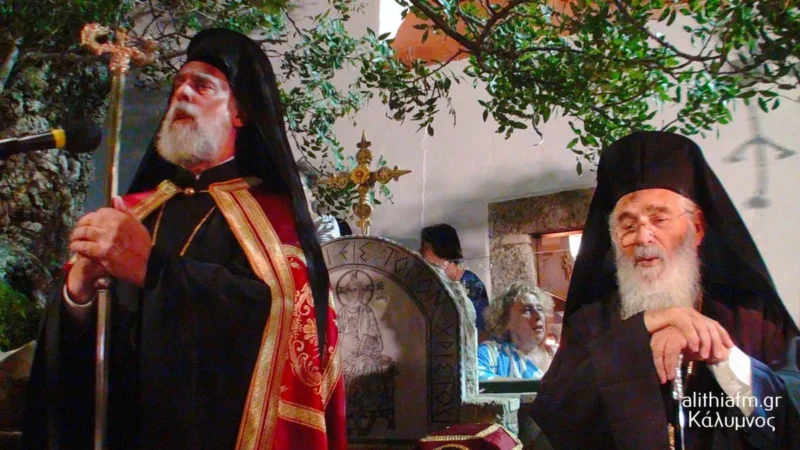 Στον Εσπερινό χοροστάτησε ο Θεοφιλέστατος Επίσκοπος Διοκλείας κ. Νεκτάριος, Πρωτοσύγκελλος της Ιεράς Αρχιεπισκοπής Αμερικής, συμπροσευχομένου του Σεβασμιωτάτου Μητροπολίτου Λέρου, Καλύμνου και Αστυπαλαίας κ. Παϊσίου, ενώ έλαβαν μέρος στον Αρχιερατικό Εσπερινό ο Αρχιερατικός Επίτροπος εν Καλύμνω πρωτ. Αμφιλόχιος Σακαλλέρος, ο Αιδεσιμολογιώτατος π. Παναγιώτης Παπαζαφειρόπουλος, διευθυντής του ιδιαιτέρου γραφείου του Αρχιεπισκόπου Αμερικής, καθώς και πλειάδα ιερέων της τοπικής Εκκλησίας.