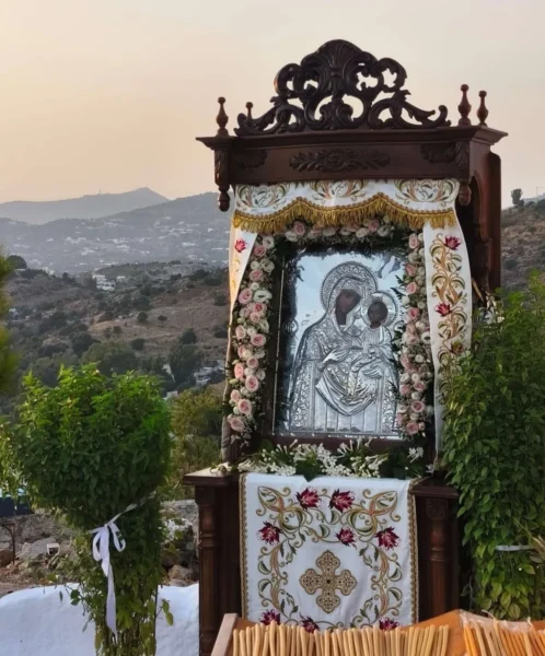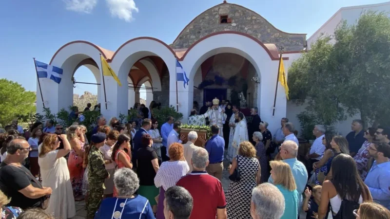 Με κατάνυξη ψάλθηκε σήμερα, Πέμπτη 14 Αυγούστου 2025, στον Ιερό Ναό της Παναγίας του Κάστρου Λέρου, ο Πανηγυρικός Αρχιερατικός Εσπερινός της Κοιμήσεως της Θεοτόκου και εν συνεχεία τα εγκώμια της Υπεραγίας Θεοτόκου μπροστά στον ανθοστόλιστο επιτάφιό Της.