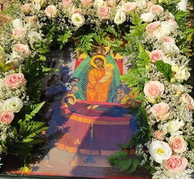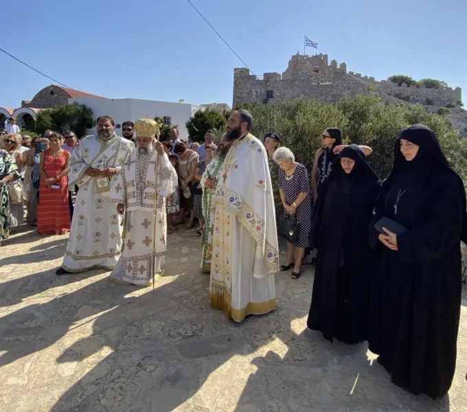 Με κατάνυξη ψάλθηκε σήμερα, Πέμπτη 14 Αυγούστου 2025, στον Ιερό Ναό της Παναγίας του Κάστρου Λέρου, ο Πανηγυρικός Αρχιερατικός Εσπερινός της Κοιμήσεως της Θεοτόκου και εν συνεχεία τα εγκώμια της Υπεραγίας Θεοτόκου μπροστά στον ανθοστόλιστο επιτάφιό Της.
