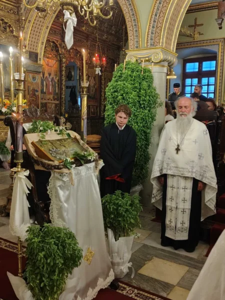 Μέγας Πανηγυρικός Εσπερινός της Κοιμήσεως της Παναγίας μας στον εορτάζοντα Ι. Ν. Παναγίας Φανερωμένης, της Ενορίας Αγίου Μάμμα, παρουσία πολύ κόσμου. Τον Εσπερινό τέλεσε ο εφημέριος π. Χριστόφορος Μελάς. Στο τέλος εψάλησαν τα Εγκώμια μέσα σε πολύ κατάνυξη.
