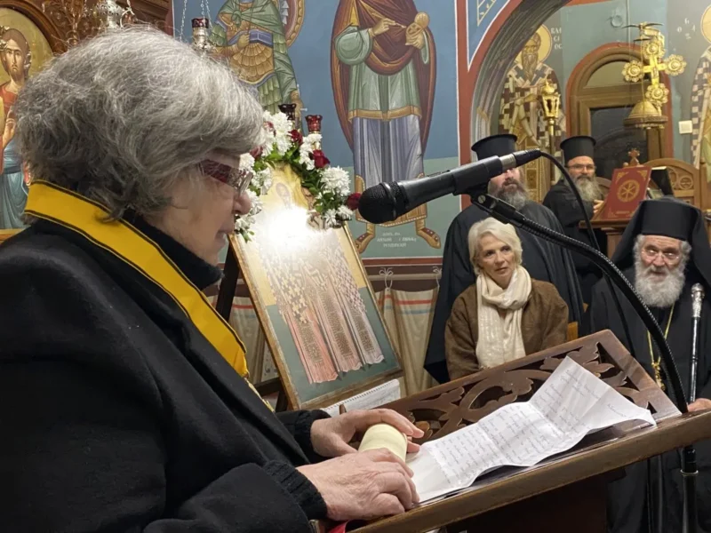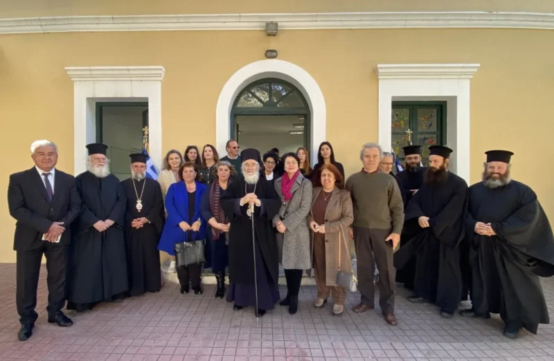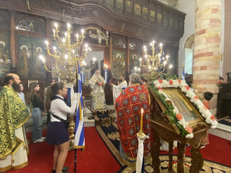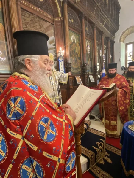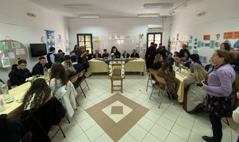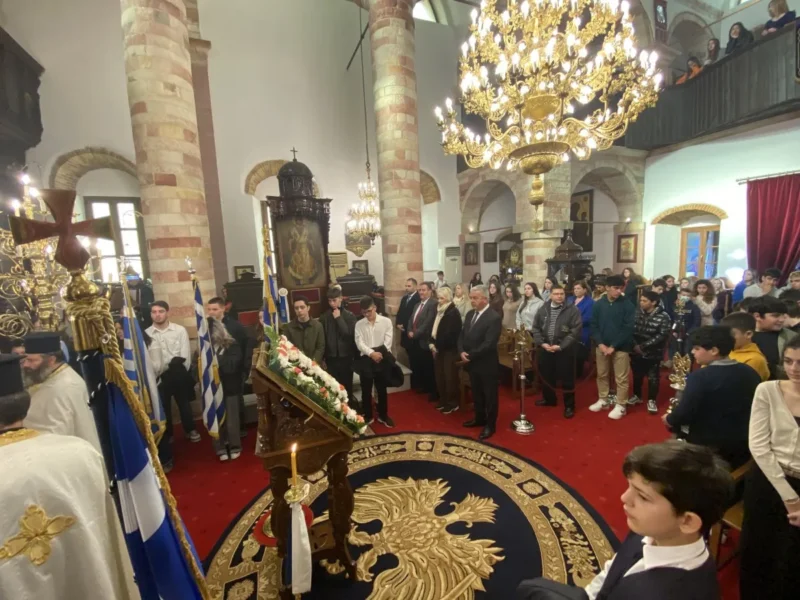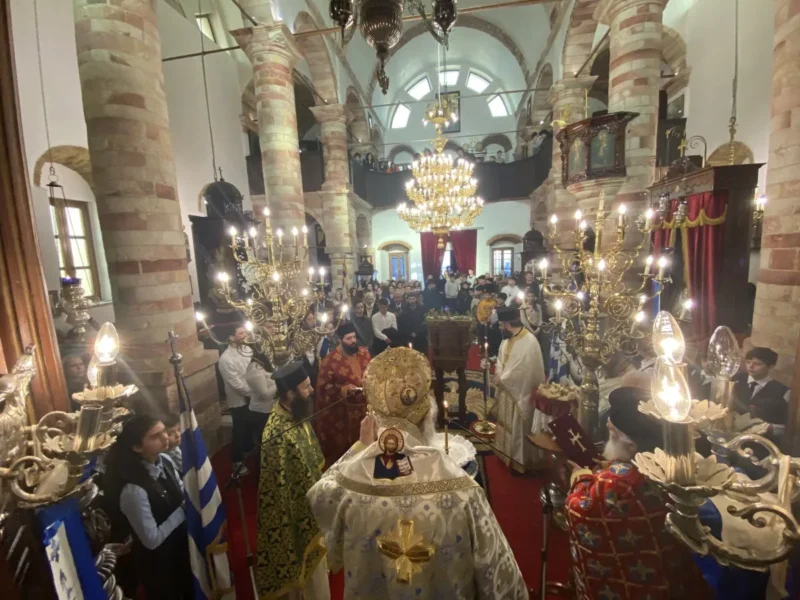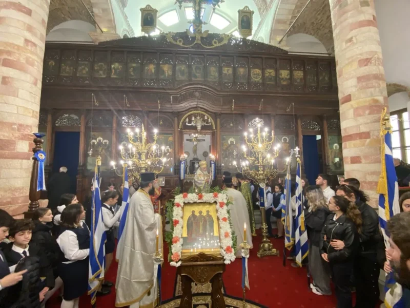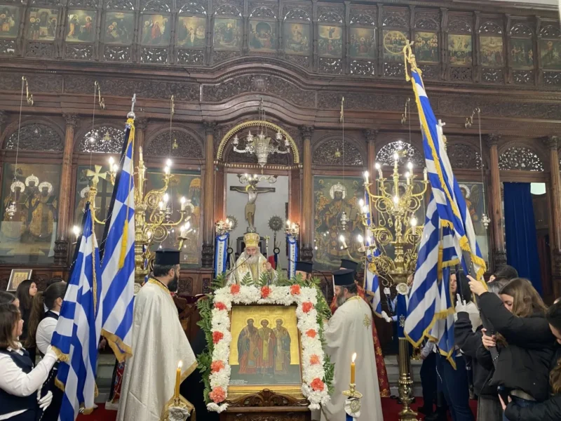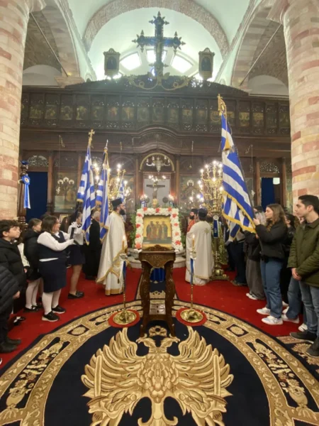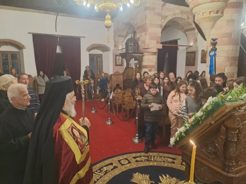 Κατά τον Εσπερινό τον Μητροπολίτη πλαισίωσαν μαθητές και μαθήτριες, οι οποίοι έψαλλαν το απολυτίκιο «τους τρεις φωστήρες της τρισηλίου θεότητος…» και ο Μητροπολίτης συνεχάρη τα παιδιά και τους διδασκάλους τους για την σεμνή παρουσία τους στην Εκκλησία.