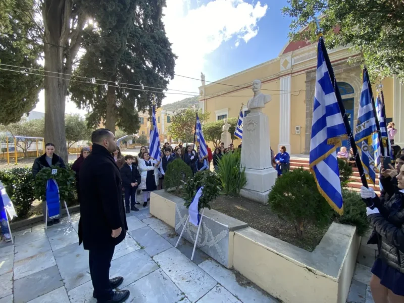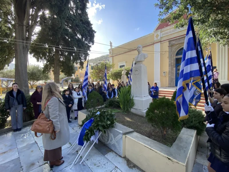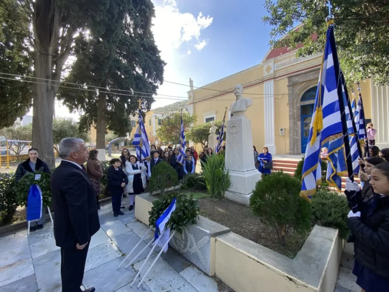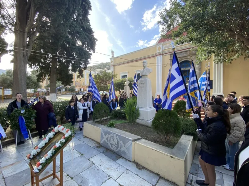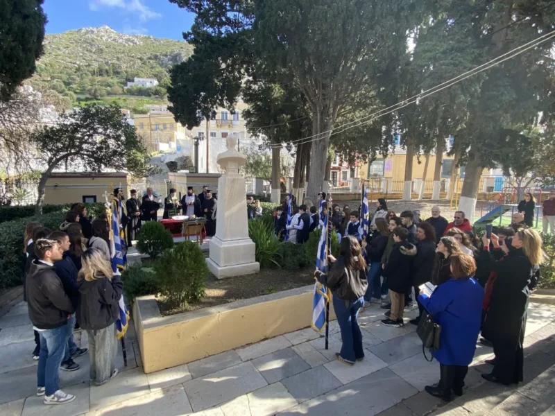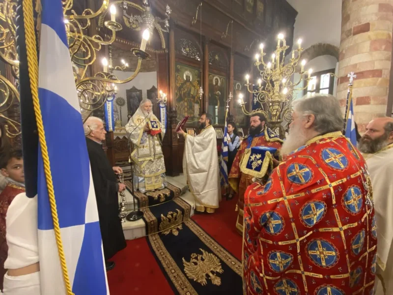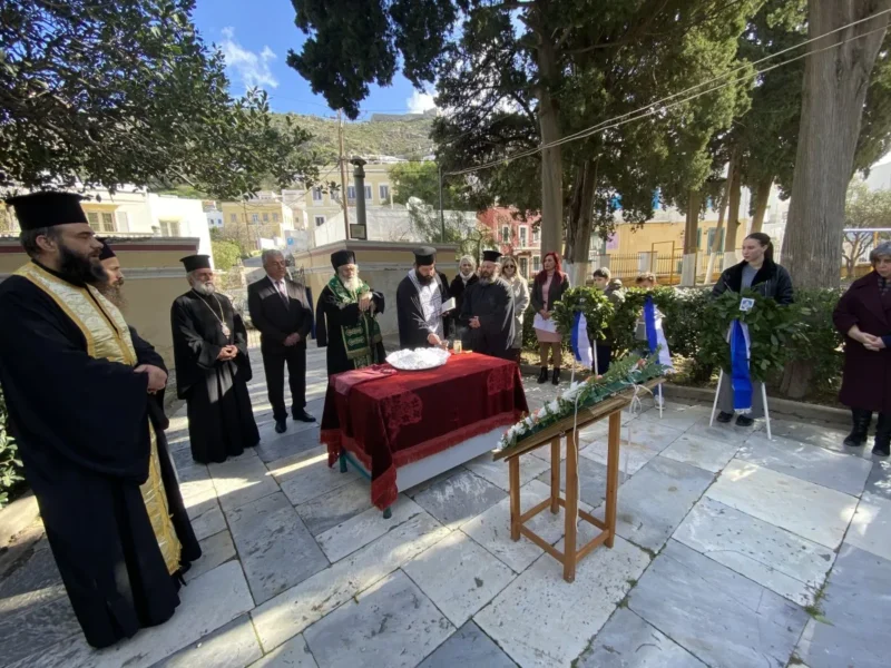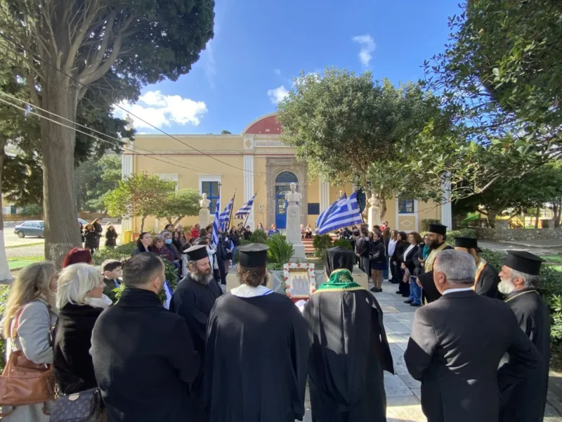 Κατά την Θεία Λειτουργία τις τοπικές πολιτικές αρχές εκπροσώπησαν οι αντιδήμαρχοι Ελ.Χέλμη, Εμμ.Μαραβέλιας και Χρ.Γιαννακός, ο εκπρόσωπος της Περιφ.Ν.Αιγαίου Ι.Θεμέλαρος, αντιπροσωπείες των σχολείων της νήσου με τις σημαίες τους, εκπαιδευτικών, γονέων και κηδεμόνων των μαθητών και αρκετών πιστών.