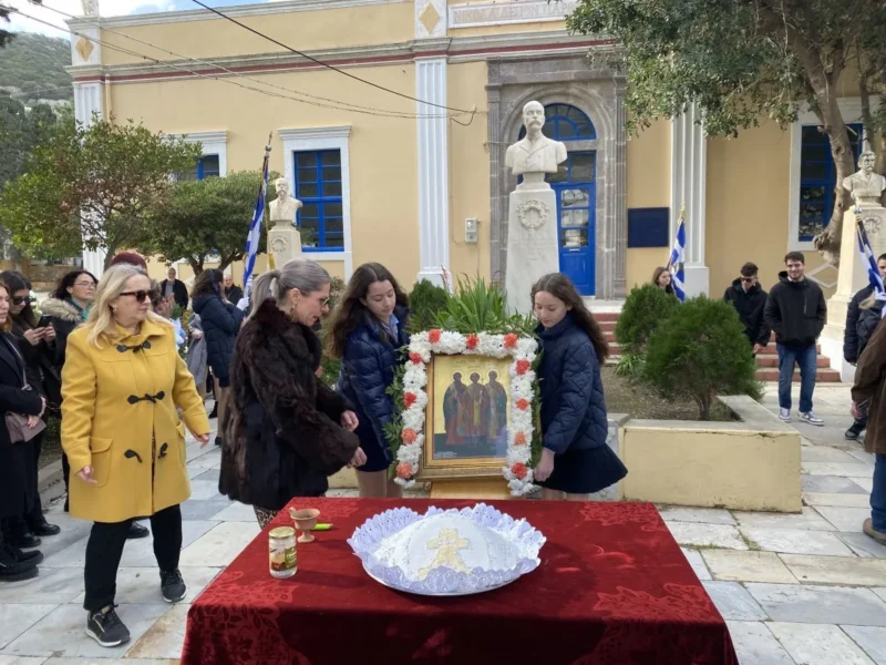 Μετά την Θεία Λειτουργία η Εικόνα των Τριών Ιεραρχών και το κόλλυβο, κατά το έθος, που κρατούσαν οι μαθητές και μαθήτριες, με πομπή, προπορευομένης της σημαίας του σχολείου, κατέληξαν στον αύλειο χώρο του «Νικολαϊδείου» Δημοτικού Σχολείου Αγίας Μαρίνης, ενώπιον των προτομών των μεγάλων ευεργετών, όπου τελέσθηκε τρισάγιο, κατατέθηκαν στεφάνια στις προτομές τους και στο τέλος εψάλη ο Εθνικός μας Ύμνος.